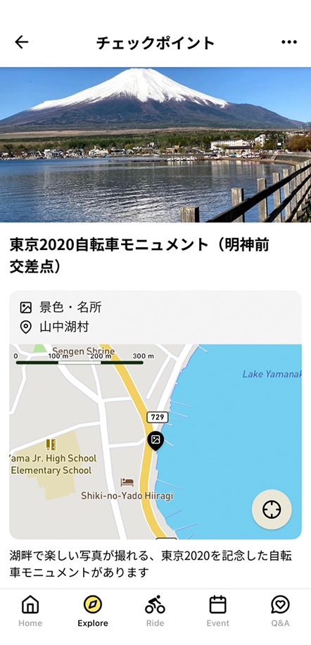 コースリストをもとに、ユーザーがリアルでライドができる。ライドの記録・記憶をお手伝い。