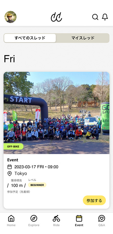 コースリストを活用したライドイベントに参加できる。選手から自主練への参加呼びかけ等にも参加も可能